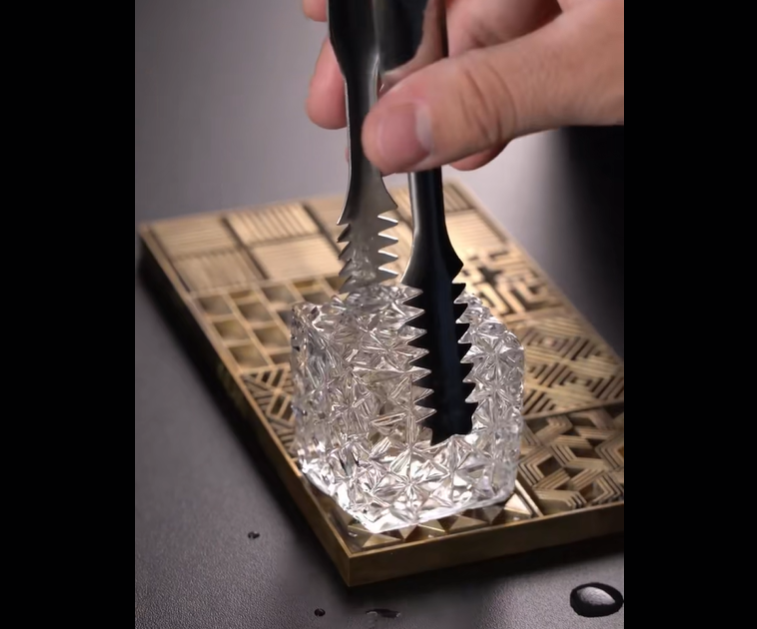 在 TikTok 上,一位素人网友分享的冰块印花模具吸引大量用户围观,视频中博主用夹子夹起刚拿出来的冰块放在模具上,四面都印刻上模具花纹,冰块瞬间时尚感满满。模具上有各种纹路的图案,用户可根据自身审美 DIY 冰块花样。有趣的 DIY 印花冰块制作过程获得了 473 万次播放与 13.1 万次点赞。