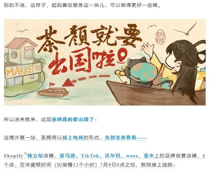 7 月 9 日,茶颜悦色通过官方微信公众号宣布正式进军海外市场,首站锁定北美地区,且以线上电商为切入点。此次将同步在 Shopify 独立站、亚马逊、TikTok、沃尔玛、weee、亚米六大平台开设品牌自营店铺,从华盛顿时间 7 月 9 日 0 点(北京时间同日 12 点)起陆续上线运营。