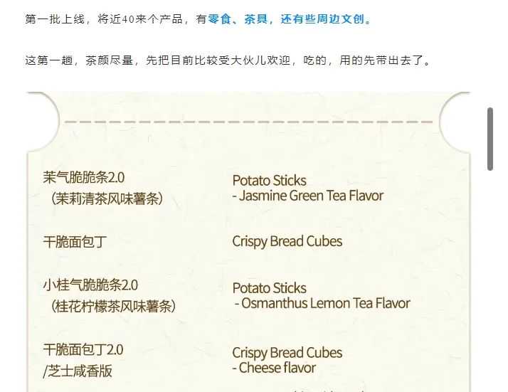 据了解,此次登陆北美,茶颜悦色首批上线 40 余款产品,包括月销百万的 “干脆面包丁”、中式文创周边等核心品类,产品口味与包装完全复刻国内爆款,定价则参考北美当地消费水平进行了微调。