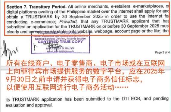 其中一大关键举措便是主动配合菲律宾电商信任标志制度的推进。作为2023 年《互联网交易法》(ITA)实施的重要组成部分,菲律宾电商信任标志已被列为强制性要求,菲律宾工贸部更是要求所有电子市场或数字平台、电商卖家必须在9月底之前获得此项信任标志的认证。