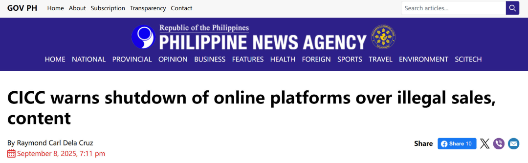 而在短短数日之后,菲律宾对线上违规内容的整治再出强硬举措。 9 月 8 日,菲律宾网络犯罪调查与协调中心(CICC)向所有在线购物和社交媒体平台发出警告,要求立即删除包含虚假新闻、售卖假冒商品或提供潜在诈骗信息的内容,并且此次“下架令”带有明确的惩戒底线——政府将持续监控,如果平台拒不配合,可能遭到封禁!