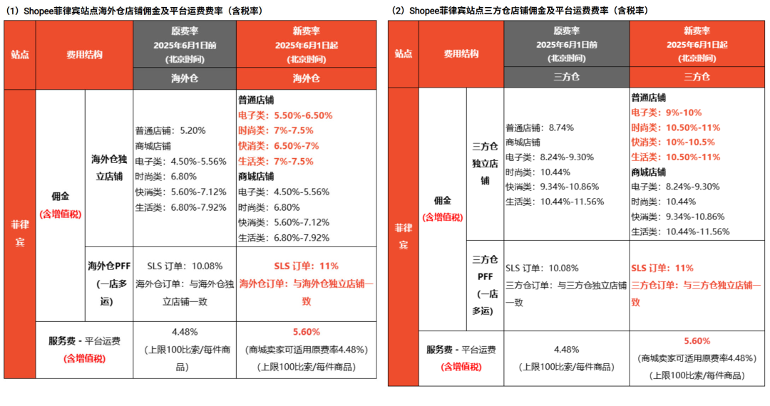 👉 运费与佣金上调:2025 年 6 月 1 日(北京时间)起,Shopee 菲律宾站点平台运费费率上调为 5.60%(含税率)。其中,商城卖家可使用原费率 4.48%(含税率)。