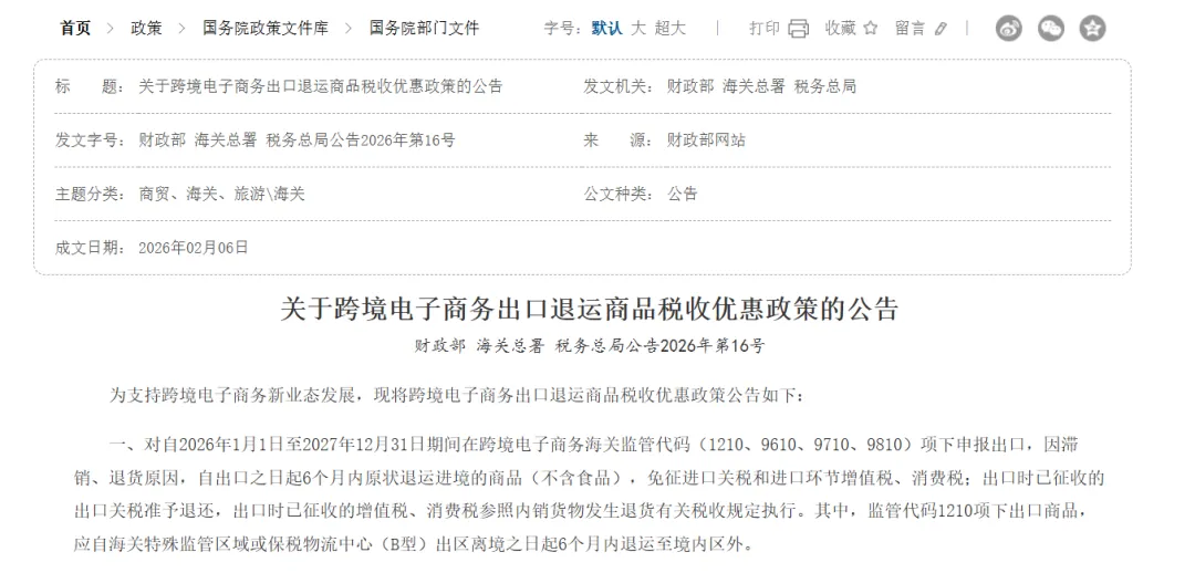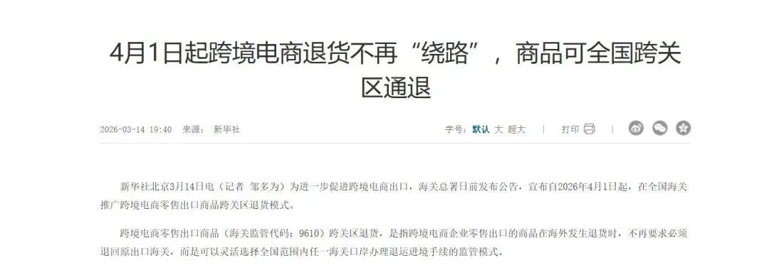 跨关区退货全国推广,与财政部等部门 2026 年发布的跨境电商出口退运商品税收优惠政策形成叠加,为企业带来了物流便利和税收减免的双重降本效应。