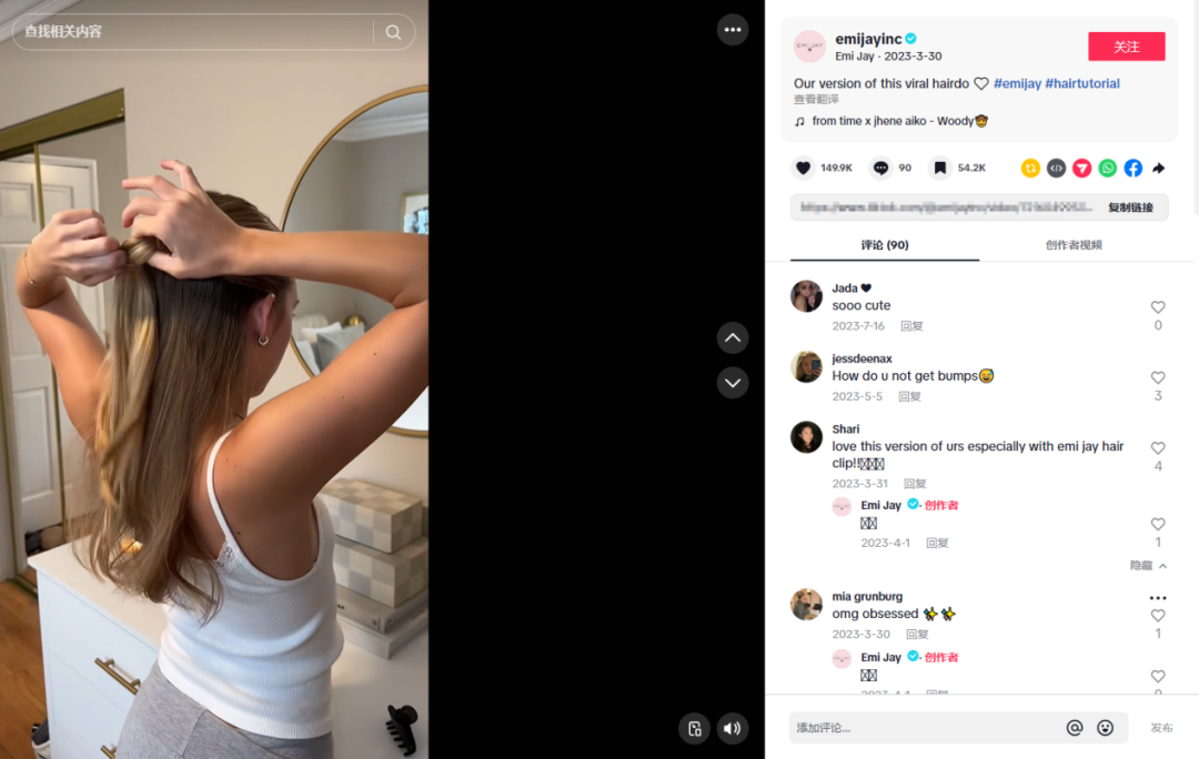 Emi Jay 非常擅长通过教程类内容展示产品价值。比如一条“viral hairdo”编发教程,把发夹巧妙融入发型教学,既直观又实用,最终在 TikTok 收获 270 万播放、14.99万 点赞。