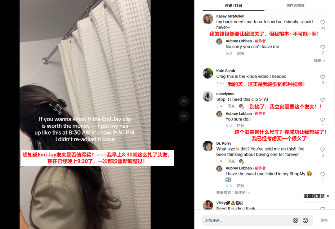 比如美妆达人 @Aubrey Lobban 通过 13 小时真实佩戴测试,证明发夹的牢固和舒适,这种场景化测评极大增强了信任感。