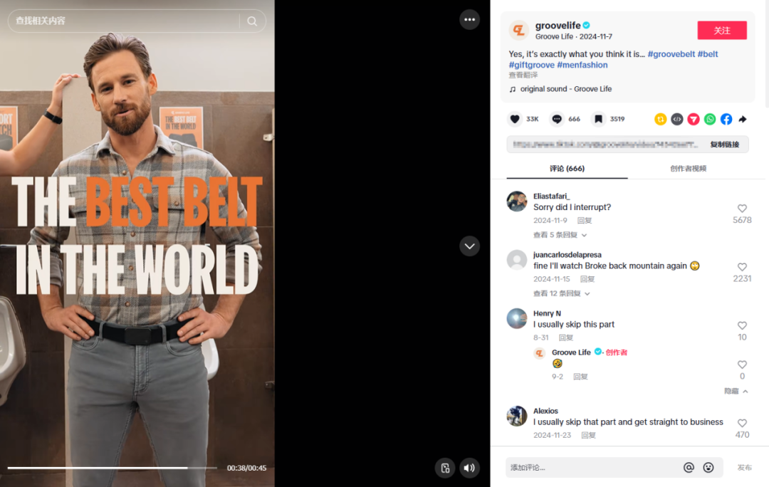 比如一条视频用情节剧的方式表现“Groove 腰带在男性圈有多火”,播放量高达 540 万。