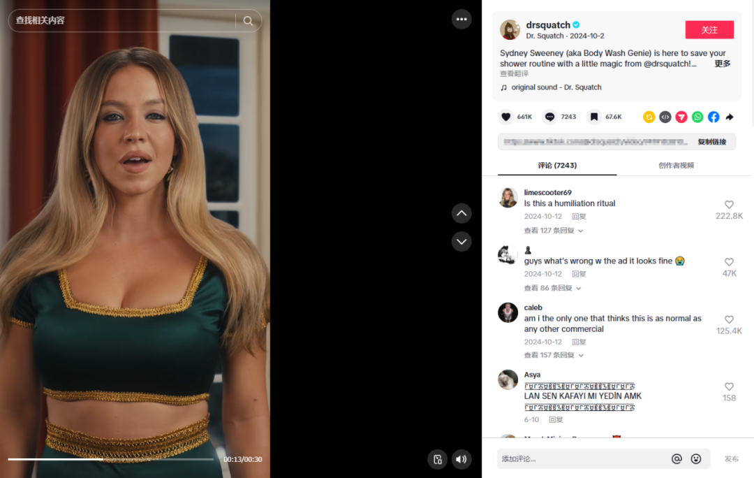 比如他们曾邀请明星 Sydney Sweeney 出演短剧,调侃“男生洗澡步骤简单”,同时突出产品多功能合一的特点。截至目前,该视频播放量已超 2960 万,成功实现破圈。