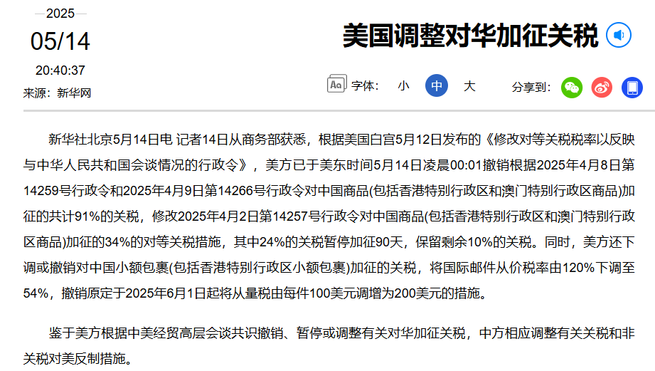 新华社最新报道,根据美国白宫 5 月 12 日发布的《修改对等关税税率以反映与中华人民共和国会谈情况的行政令》,美方已于美东时间 5 月 14 日凌晨 00:01 撤销 4 月 8-9 日对中国加征的 91% 关税,修改 2025 年 4 月 2 日加征的 34% 的对等关税措施,其中 24% 的关税暂停加征 90 天,保留剩余 10% 的关税。同时,对中国价值 800 美元或以下的小额包裹,征收关税将从原先的 120% 降到 54%,包裹的每件固定关税费用维持不变,仍然是 5 月 2 日后的 100 美元。