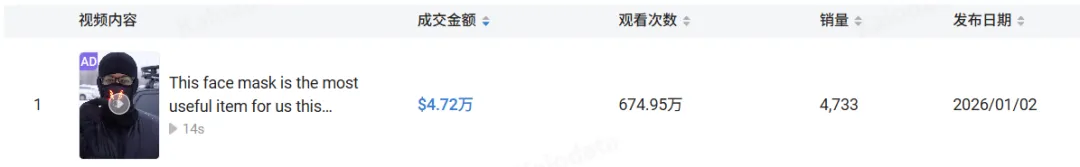 真正把这款面罩推上高位的,是一条只有 14 秒的短视频。视频发布于 1 月 2 日,目前播放量超过 653 万,单条视频直接带来 4386 单成交,贡献 GMV 超过 4.38 万美元。