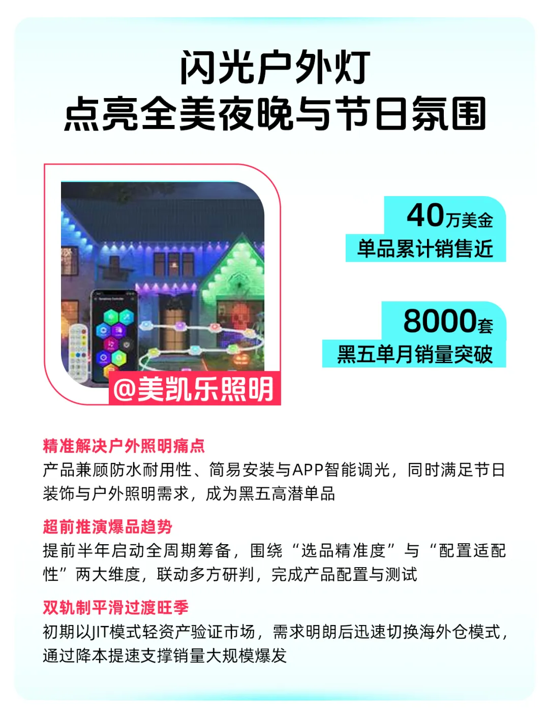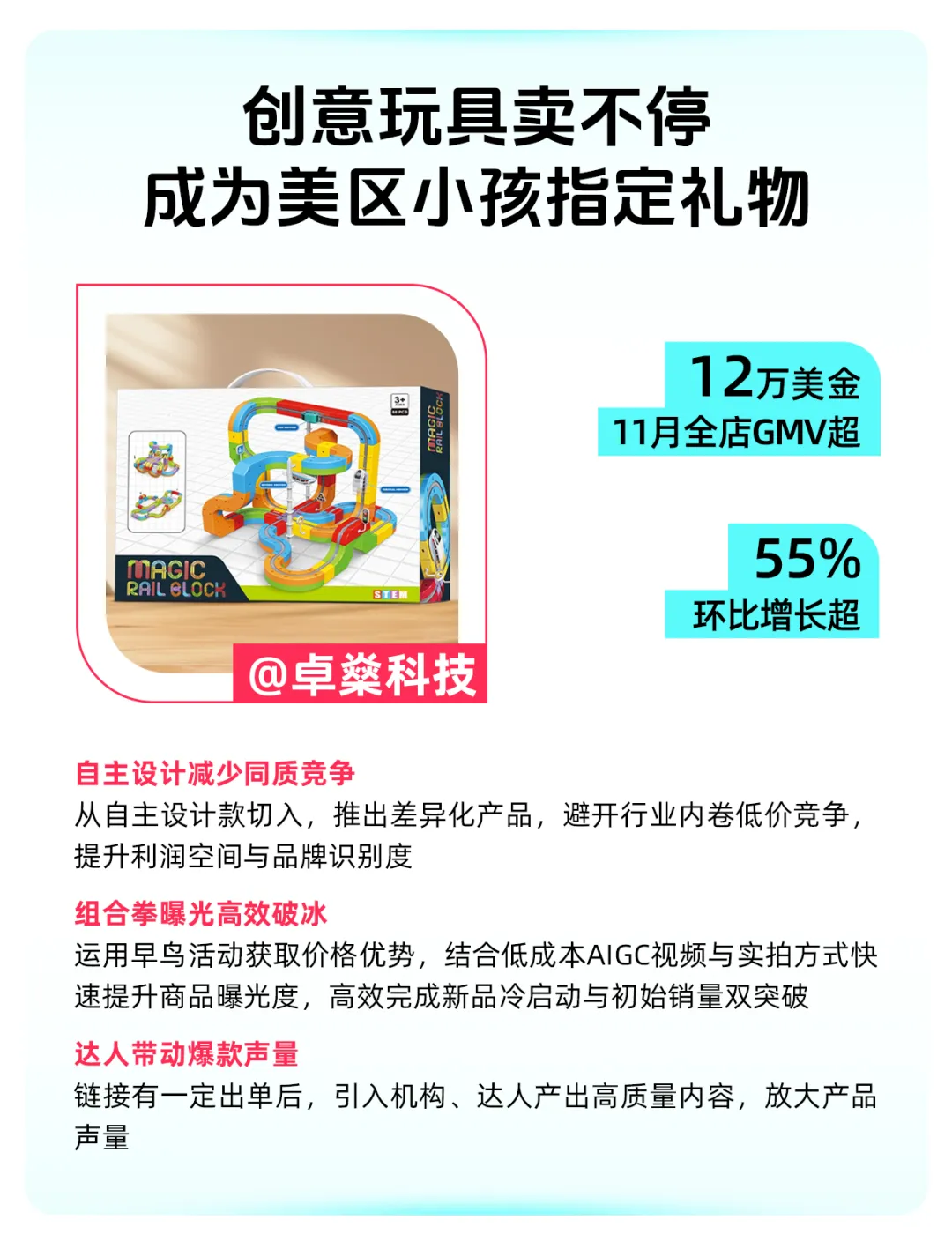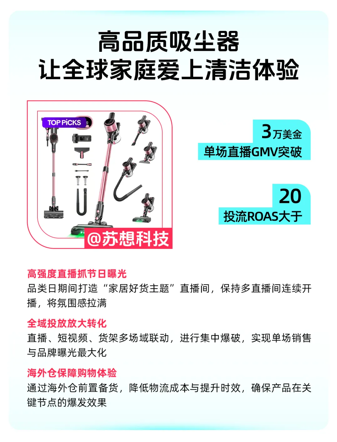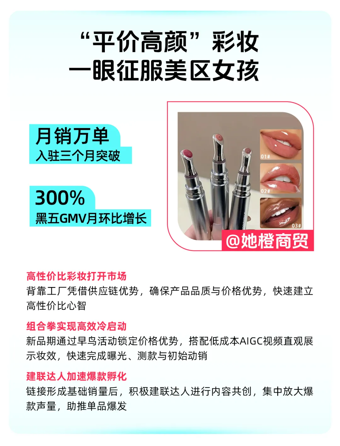 她橙美妆新店入驻三个月即突破月销万单,黑五期间环比增长超300%;苏想科技一款吸尘器单场直播GMV超3万美金;乐檬服饰凭借宠物圣诞装,单月销售额环比飙升230%……