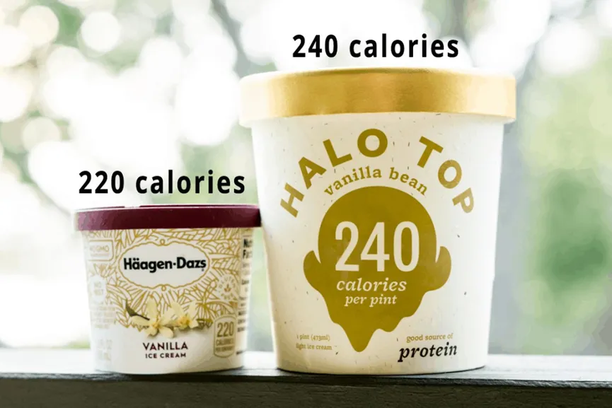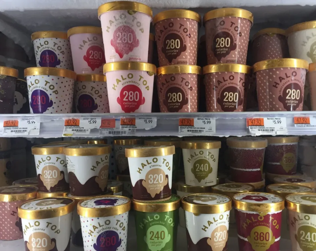 如果你在美国逛过超市,大概率见过这样一款冰淇淋:包装极简,桶身正中央印着一个巨大的热量数字,它叫 Halo Top。