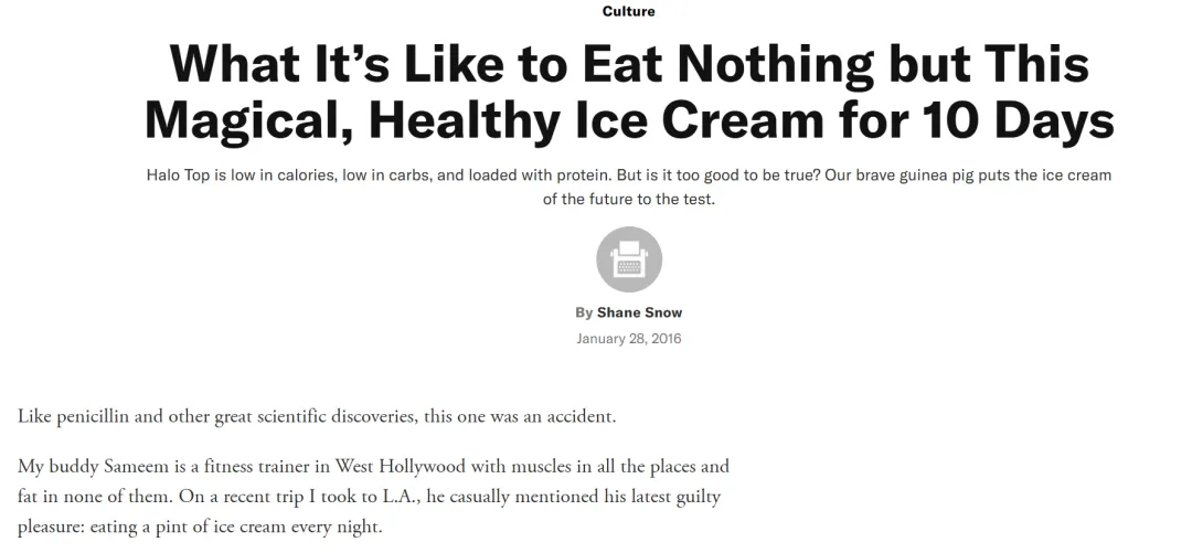 2016年,《GQ》杂志编辑 Shane Snow 发了一篇名为 《连续10天只吃这种“神奇又健康”的冰淇淋,是一种什么体验》 的文章。