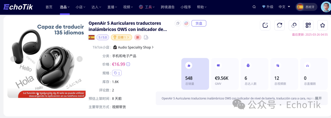 例如名创优品X15Pro耳机在中国生产,通过TikTok渠道以8.99-19.99美元低价覆盖西班牙市场。三款翻译耳机上线不足一年即创800万美元销售额。