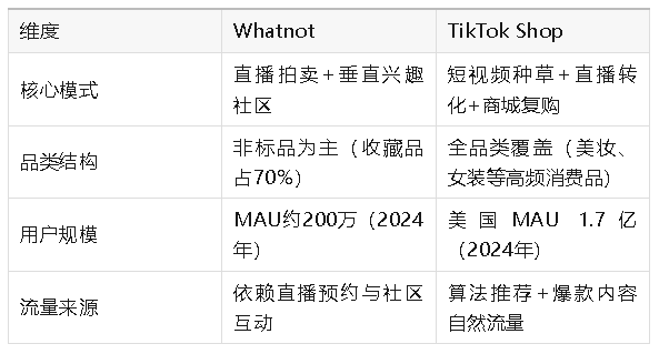 无短视频生态支撑:Whatnot 依赖直播单一场景,购买需长时间停留(平均 80 分钟),而 TikTok 碎片化购物适配大众消费习惯。