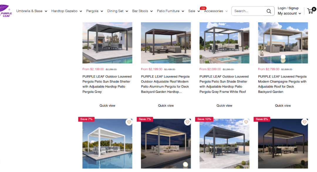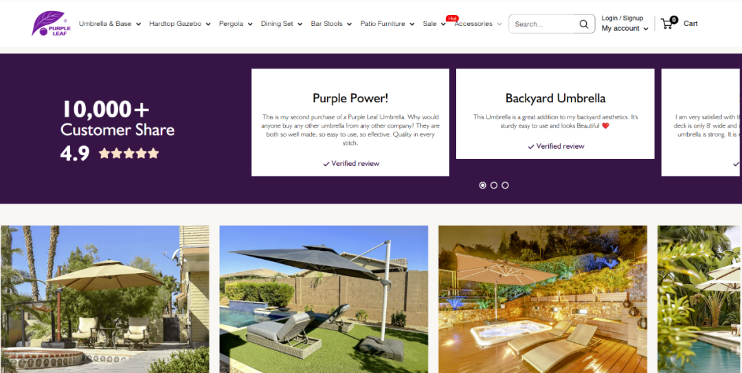 除遮阳伞外,PURPLE LEAF 围绕庭院场景,在独立站上线产品数已增加 20 余款,打造丰富的 SKU。