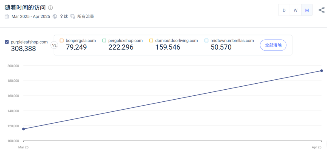 Simlarweb 数据显示,2025 年 3-4 月,品牌独立站月访问量达 30 万次,流量处于持续上涨趋势。其中,直接流量占 43.14%,有机流量占 22.43%,付费流量占 21.44%。