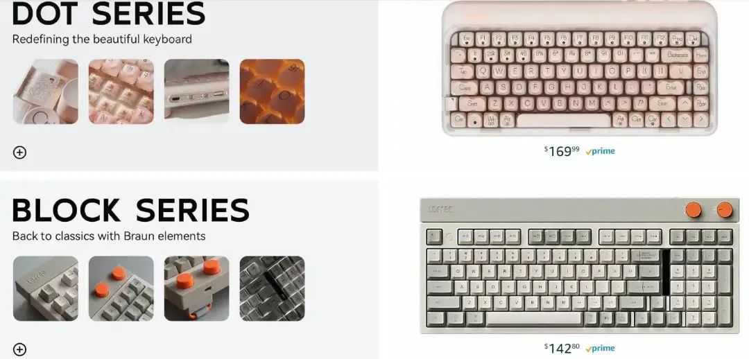 为了快速打入海外市场,Lofree 选择以流量基础庞大的亚马逊作为主战场。品牌方舟了解到,亚马逊键盘类目 Best Seller TOP5 产品均主打低价策略,定单价基本不超过 20 美元。而观察 Lofree 的亚马逊官方店铺可以发现,其定价区间普遍在 140 美元~200 美元,主打中高端市场。