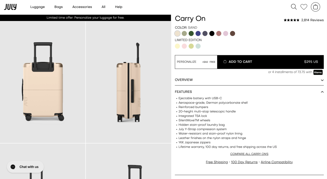 其次是个性化服务。调研中发现,个性化是箱包用户的核心需求之一。因此,July 推出免费刻字(支持英文、中文等多种语言,甚至 emoji)、8 种哑光配色和联名图案设计,例如与澳洲时尚品牌 Oroton 推出的海岸蓝系列上线 5 分钟售罄;2024 年为奥运会定制的“金绿配色”行李箱,带动品牌官网日均访问量增长 300%,官网日均订单量增长 220%。