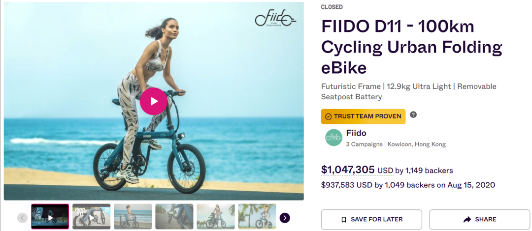 2020 年 Fiido 推出 D11 折叠电动自行车,通过在 Indiegogo 上发布产品广告宣传片等,突出产品核心功能,以视频或清晰图片展现新款电动自行车的亮点外观设计,吸引骑行爱好者关注。