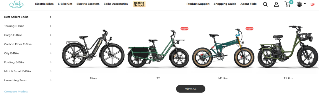 Fiido 独立站显示,旅行电动自行车、货运电动自行车、轻型电动自行车、城市电动自行车、折叠电动自行车、迷你和小型电动自行车等 11 种电动自行车车型,覆盖户外出游、城市通勤、山地骑行等多场景使用,满足消费者个性化需求。