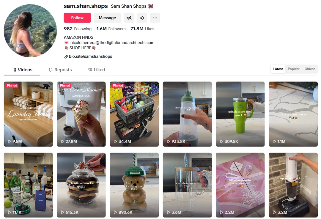 @sam.shan.shops,是TikTok平台聚焦家居/节日礼品赛道的家居生活类中腰部达人,核心受众为25-34岁北美女性(占比34.5%)、18-24岁女性次之(21.63%),多为家庭消费决策主导者,地域集中在加拿大(44.92%)和美国(40.71%);粉丝带强烈购物导向,高频互动主题涵盖家居/节日礼品/厨房好物,节日内容爆发力突出。
