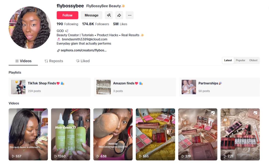 @flybossybee是TikTok平台聚焦美妆/购物赛道的中腰部好物测评达人。核心受众以年轻女性为主导,25-34岁女性占比49.67%,18-24岁女性占比16.3%,合计女性粉丝达76.51%,完美契合购物内容主题;地域高度集中在美国,粉丝消费偏好强烈,内容上以节日购物相关为主。