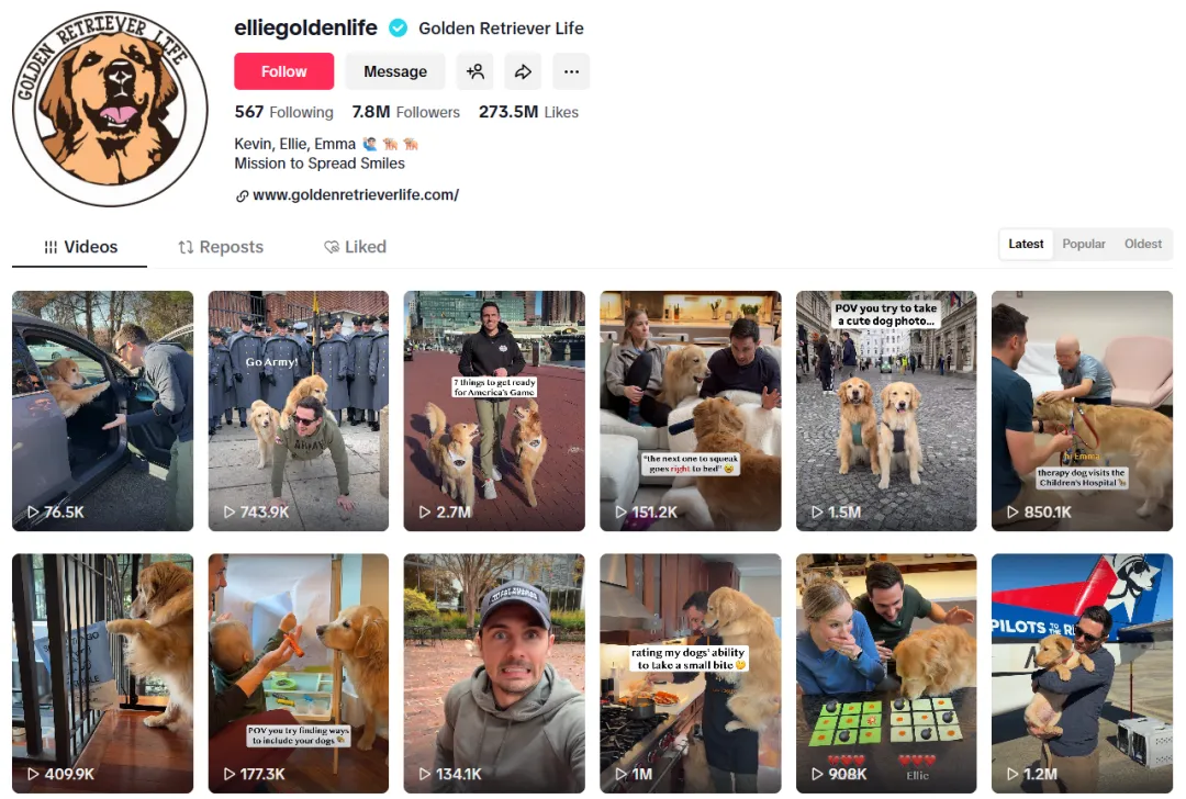 @elliegoldenlife是TikTok平台聚焦宠物赛道的垂类达人。其粉丝地域高度集中(美国占比79.53%),剩余粉丝多来自加拿大、英国、澳大利亚等英语国家(合计15.16%),适配北美本土化营销;核心受众为18-44岁女性(合计占比60.94%),对情感化内容和家庭场景接受度高,精准覆盖养宠家庭核心决策人群