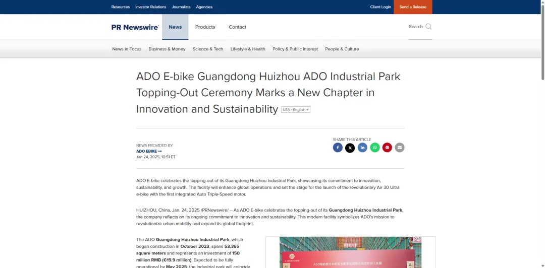 2025年1月24日,ADO在PR Newswire发布惠州工业园封顶新闻,看似讲产能,实则暗藏Air 30 Ultra新品预告:明确公布 “与八方共研、全球首款集成3速自动变速电助力车、2月众筹上线”,同时放出工业园53365㎡、投资1.5 亿元、年产能20万台的硬实力数据。
