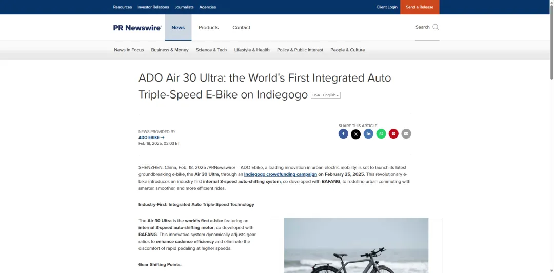 2025年2月18日,ADO发布专属产品PR稿,抢占 “全球首款” 的技术话语权。稿件内容不只是讲参数,而是技术卖点翻译为用户收益:指出传统单速车的 “踩踏空转” 痛点,说明自动变速能让加速到25km/h 时保持舒适踏频;同时补充超薄电池、100 公里续航等实用卖点,结尾直接给出 CTA 转化指引 ——2月25日Indiegogo上线、最高40% 早鸟优惠、引导加入Facebook社群,为众筹蓄水精准流量。
