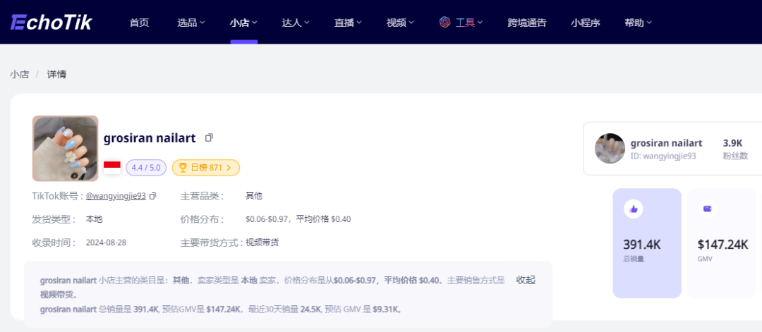 从数据分析网站 Echotik 可以看出,小店 @grosiran nailart 的主要客群来源,是通过短视频和达人带货。