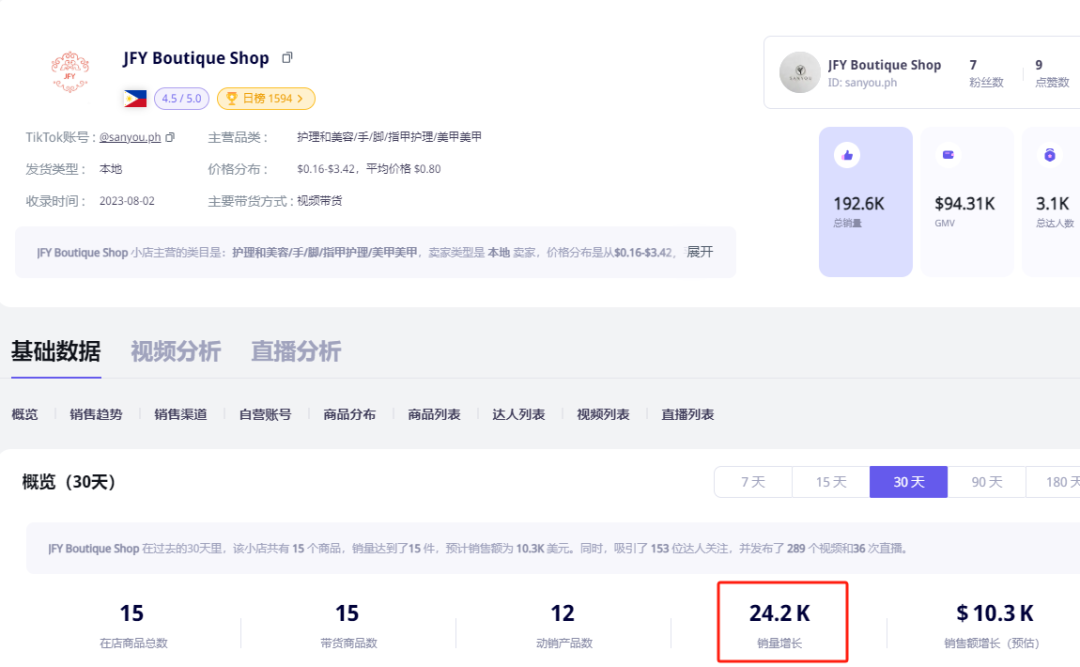 与之相对的,菲律宾的另一家 TikTok 小店 JFY Boutique Shop(@sanyou.ph)也表现亮眼,近一个月销量接近 2.5 万件!其中,达人带货同样是其主要增长动力。