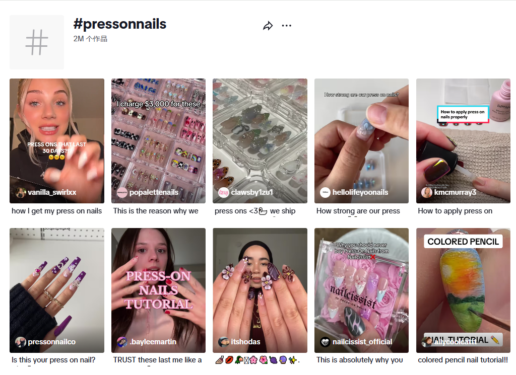 而在 TikTok 上,搜索话题标签 #pressonnails 也可以发现,它拥有超 200 万个作品,并且从当前形势看仍呈增长趋势,在商品发布时带上这个话题,足以直接覆盖到广阔的目标群体。