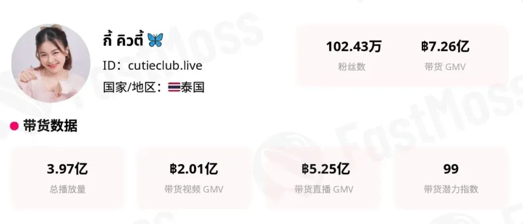 在全球内容电商加速跃迁的2025年,FastMoss数据研究院发布的《2025 TikTok生态发展白皮书》,集结了多国市场一线品牌实战专家与头部达人的真知灼见。其中,泰国顶流带货达人@cutieclub.live(以下简称Cutie)的实战经验尤为亮眼——她以超7亿泰铢的带货GMV、泰国直播电商排名第六的战绩,以及102万忠实粉丝,成为泰国直播电商领域的标杆人物。