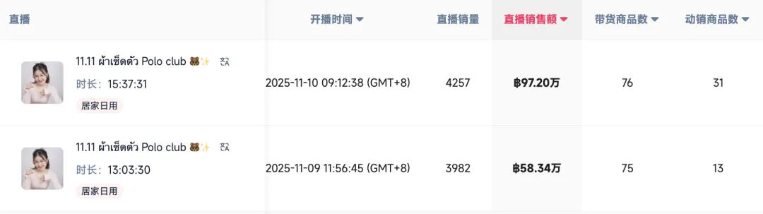 Cutie的实战智慧,在大型促销节点上体现得淋漓尽致。以刚刚过去的“双十一”为例,11月10日,她创下单场97.20万泰铢的销售额,前一日也达到58.34万泰铢,展现出强大的爆发力。