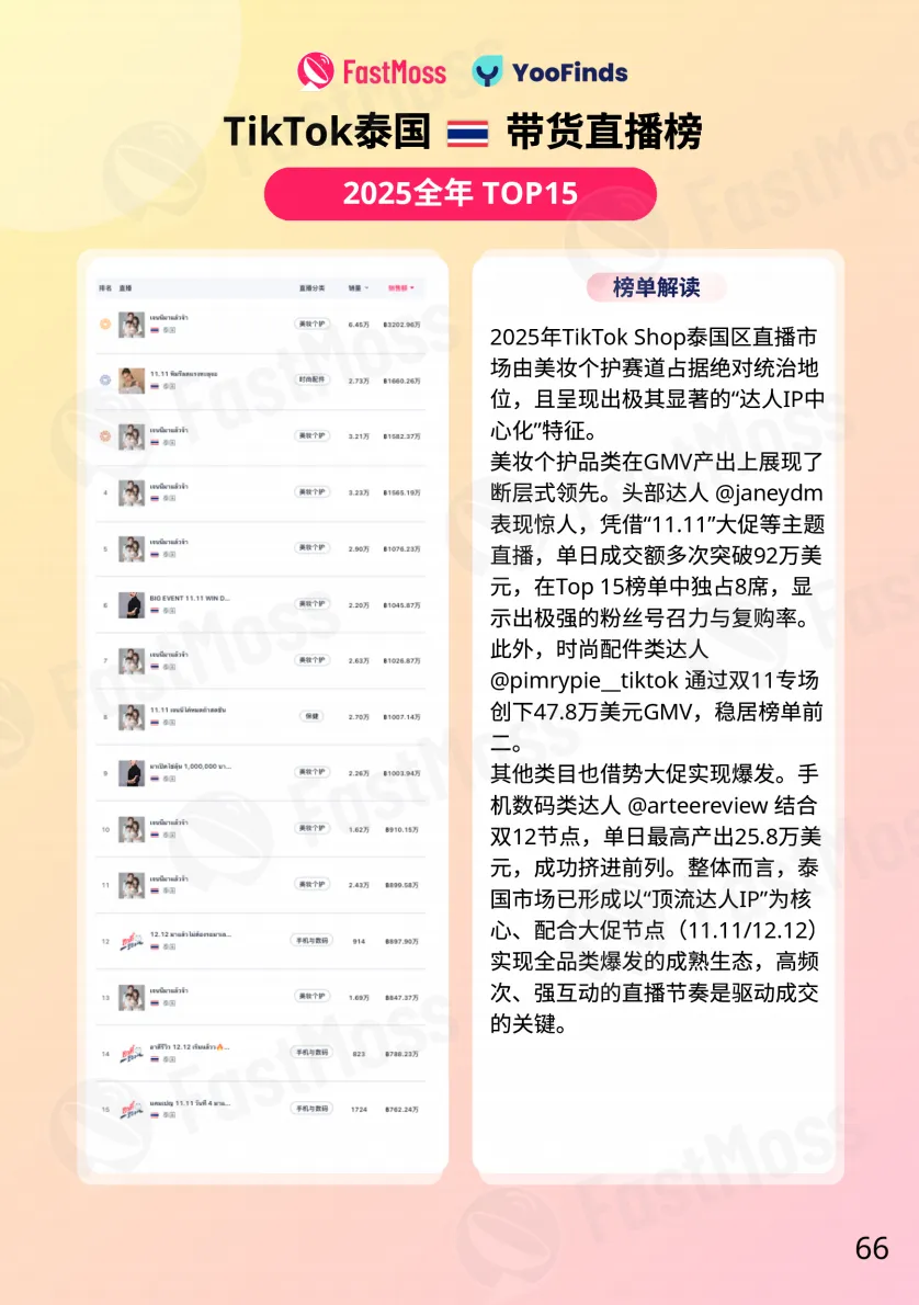 根据FastMoss白皮书对泰国Top直播榜单的追踪分析发现,泰国市场已形成一个鲜明特征:以 “顶流达人IP”为核心,依托双11/12等大促节点实现规模化爆发。这些头部达人的直播间在大促期间成为流量与销量的双重焦点,凭借其深厚的信任资产与号召力,能够有效带动多种商品的集中销售。