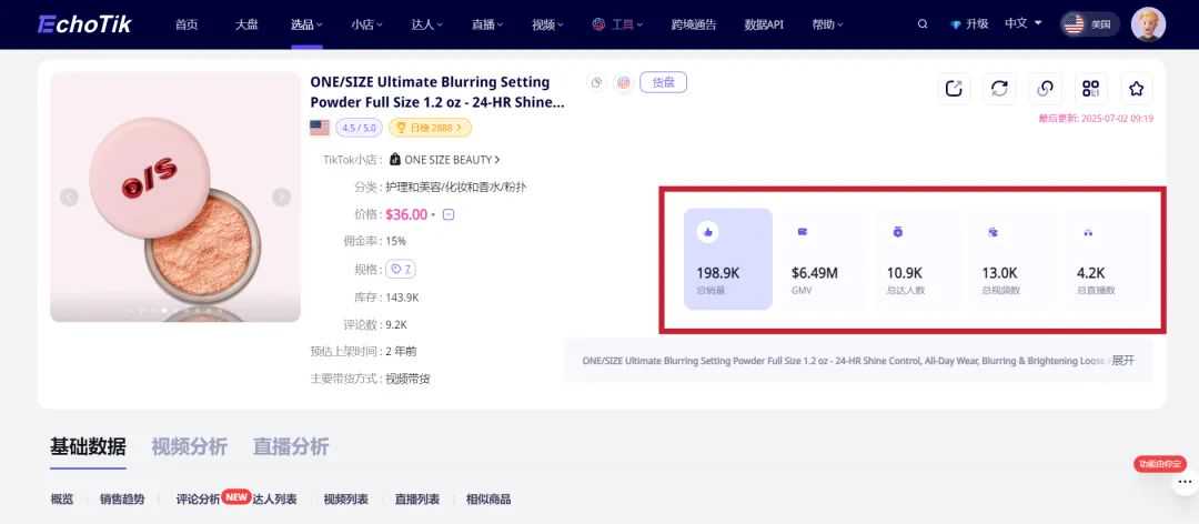 近日TikTok美区一款定妆散粉卖爆,根据EchoTik数据显示该散粉7天卖出6.43万单,总GMV达到649万美元,成为美妆品类霸主势头正猛。