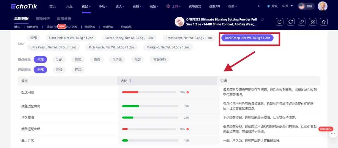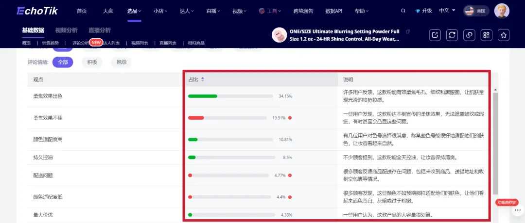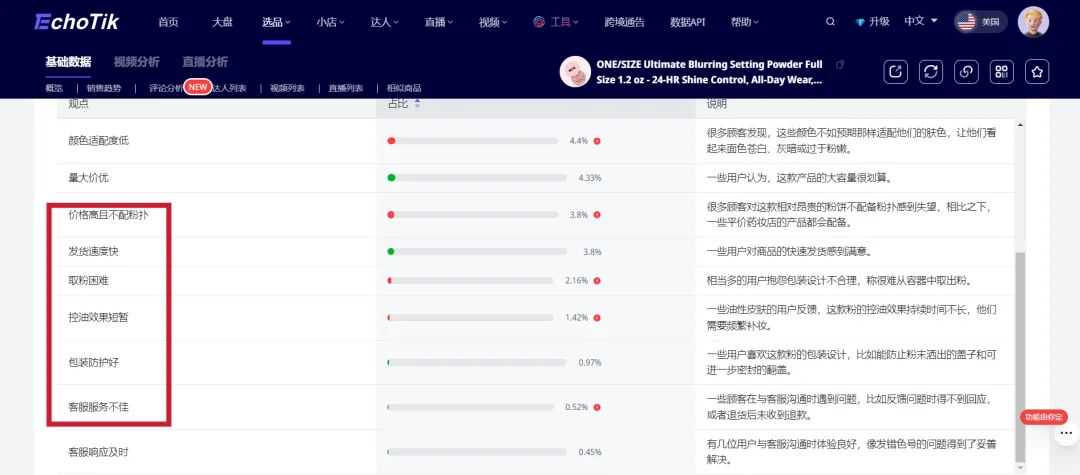通过简单的查询,我们会发现这款散粉SKU色号众多,满足了不同肤色人群需求,又能在夏天控油,容量大颜值高基本满足美区消费者需求。如果我是美区卖家,下一步选品必然会紧跟趋势。但.......如果我们没有增加评论分析功能,你是否能发现这款散粉也存在色号饱和度高、没有粉扑、取粉困难、容易洒落、物流出错等负面评价呢?