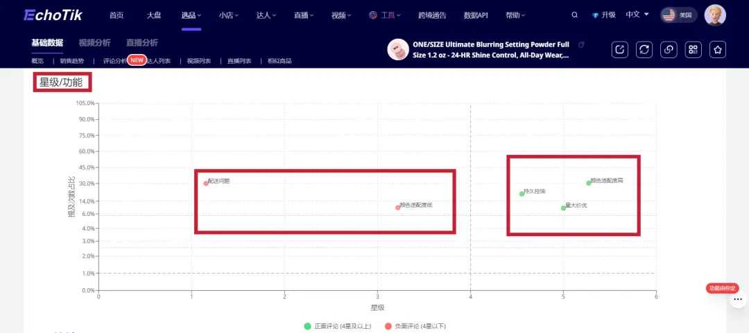 可视化的【星级打分】也是直观评价商品的重要指标。我们根据前面散粉的正负评价将功能点分为:4星以上的正面评论和4星以下的负面评论。不止散粉选品的时候可以规避鸡肋功能,在视频脚本撰写、直播卖货的时候也可以突出大众买点,同时强调配备粉扑、容易取粉等优点,对该爆品进行优化升级!