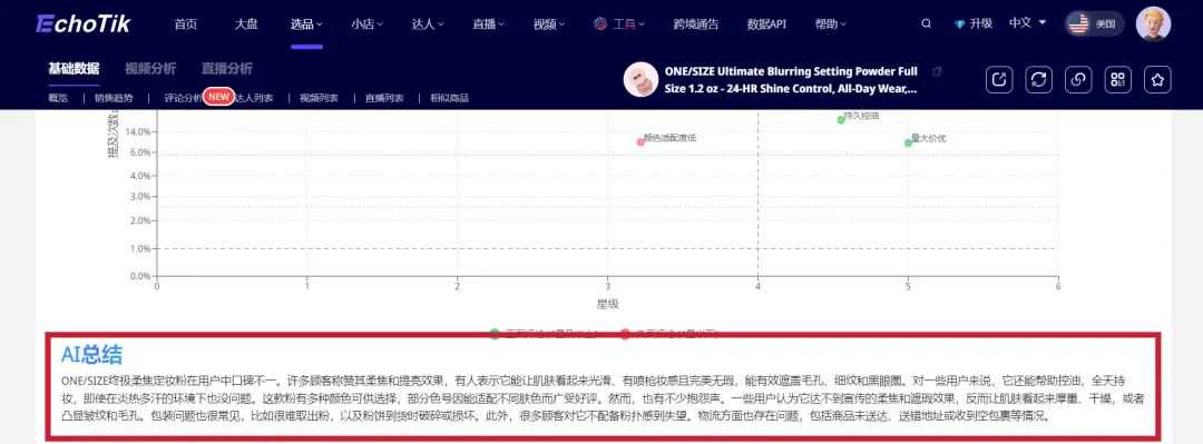 最后【AI总结】会帮你智能整理该款散粉的褒贬评价,帮助你梳理选品思路。有了评论分析功能的辅助,选品就不只是蒙着眼copy,你也能轻松做出差异化爆品!