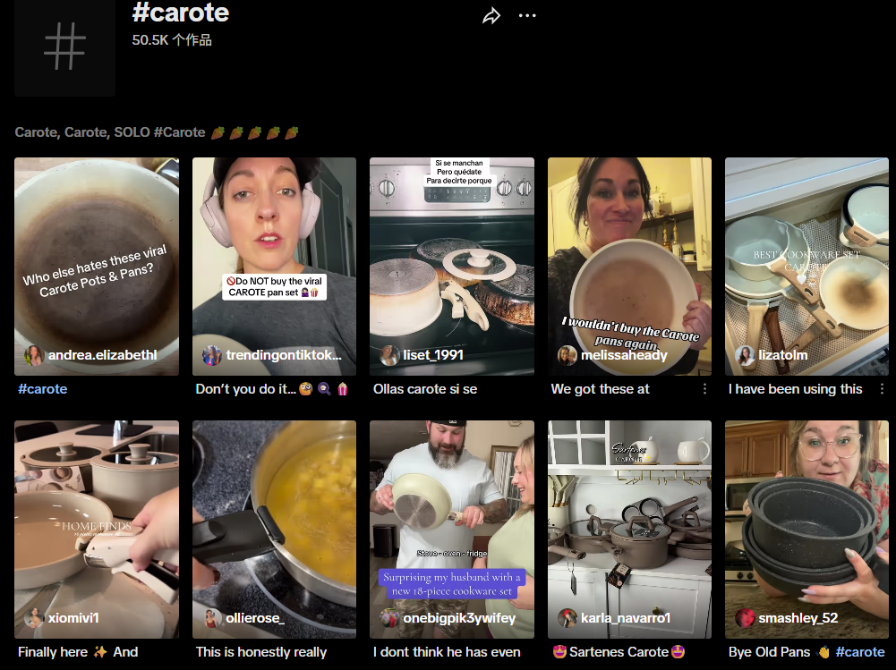 TikTok 上,#carote 标签下视频数量超 5 万条,单条视频播放量超百万甚至千万,品牌与大量家居、美食博主合作,通过内容共创、红人分享的方式,提高产品曝光。