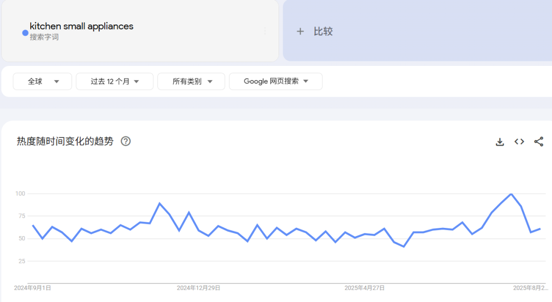 谷歌趋势数据显示,过去一年,“kitchen small appliances(厨房小家电)”一词全球范围内搜索热度持续在 41—100 之间,全年保持稳定高位运行,未出现明显季节性波动,加拿大、美国、澳大利亚等为主要关注者。