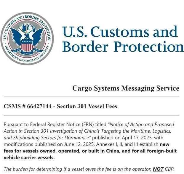 前段时间,美国海关与边境保护局(CBP)宣布自 2025 年 10 月 14 日起实施针对性收费政策,对中国拥有或运营的船舶采用阶梯式收费:初始为每净吨 50美元,2028 年将升至 140 美元/净吨,每船年收费上限 5 次。