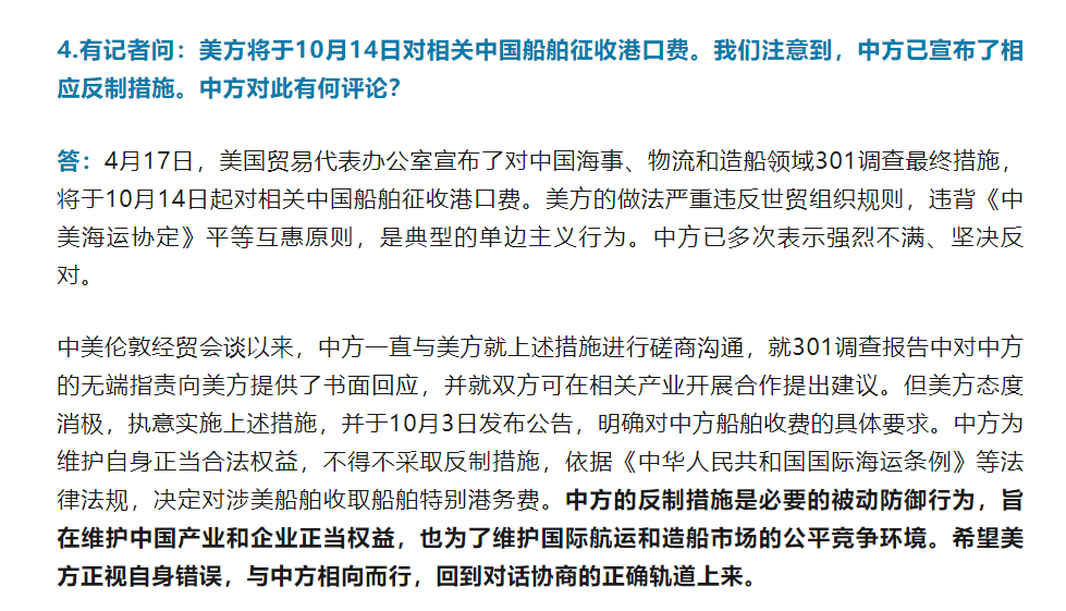 在美国宣布自 2025 年10 月 14 日起,将对中国企业拥有或经营的船舶、中国籍船舶及中国造船舶加收港口服务费之后,中方交通运输部采取反制措施。