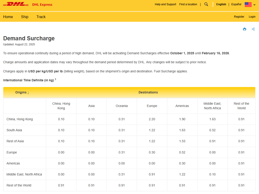 FedEx 的旺季附加费标准较 2024 年进一步提升,根据FedEx发布的通知显示,2025年的旺季附加费已于9月22日至10月19日期间生效。除常规超规包裹附加费外,新增两项加急服务附加费,并对业务量激增的大客户额外收取住宅配送费。