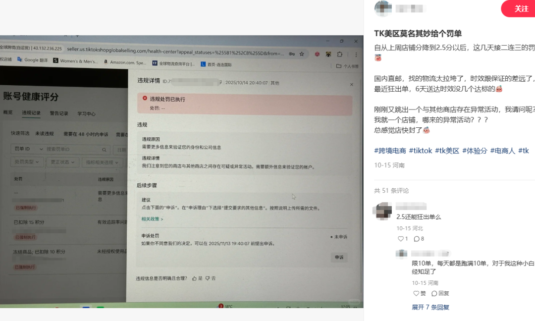 日前,一位TikTok Shop美国站卖家在社交媒体发帖称,店铺接二连三地收到平台发来的违规处罚通知。