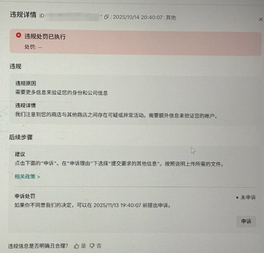 根据该卖家提供的截图显示,平台告知的违规详情仅仅是一句话:“我们注意到您的商店与其他商店之间存在可疑或异常活动。需要额外信息来验证您的帐户。”