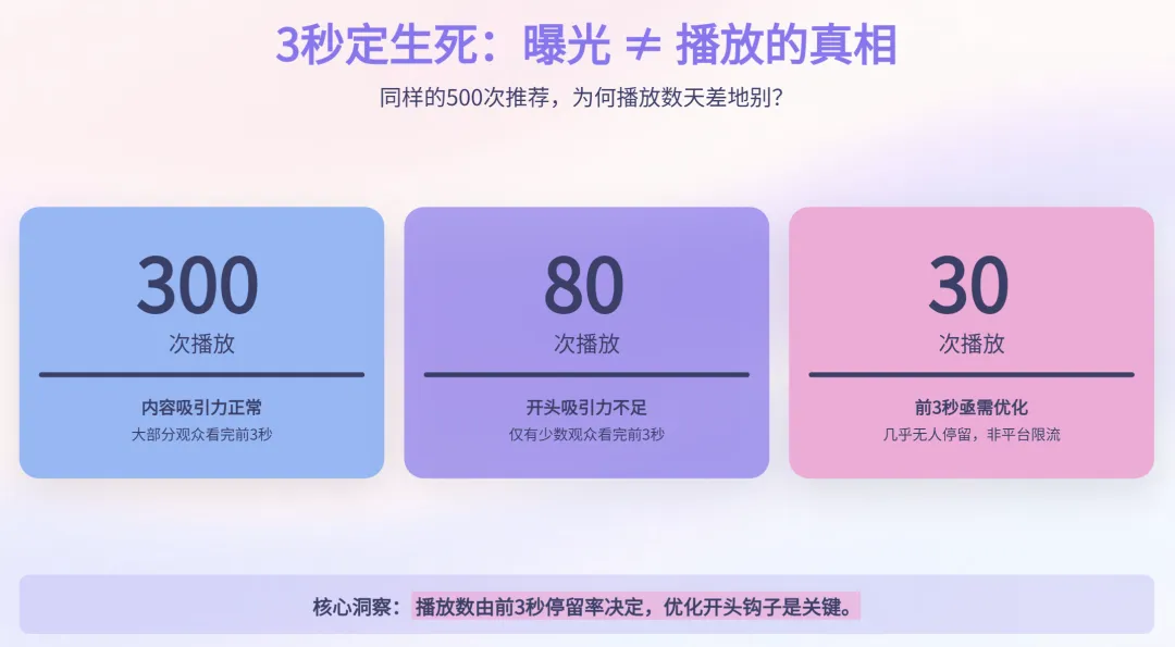 500曝光+30人停留≥3秒→30播放,不是被限流,只是你的视频没留住人。