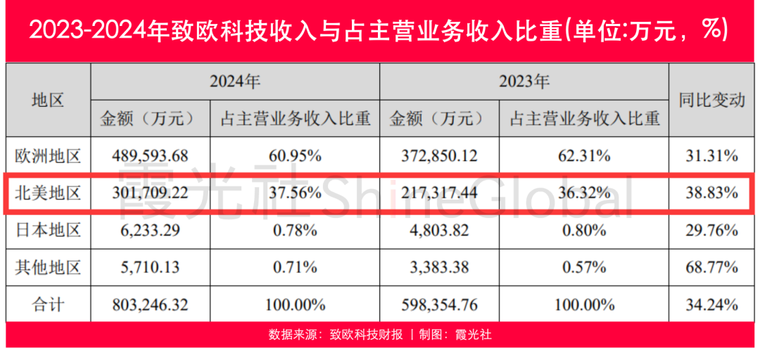 2024 年,致欧科技在北美地区收入来到了 30.17 亿元,同比大增 38.83%。