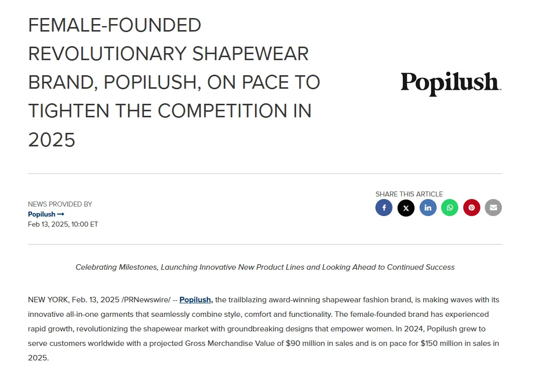 Popilush 以直面消费者的电商模式起步,从最初的内置塑形连衣裙,逐步拓展至连体衣、家居服等品类。2024 年,品牌宣布将推出塑形裤装、基础内衣线及运动服饰系列,以覆盖更多场景。