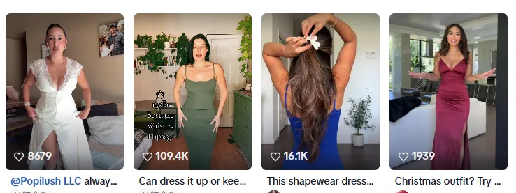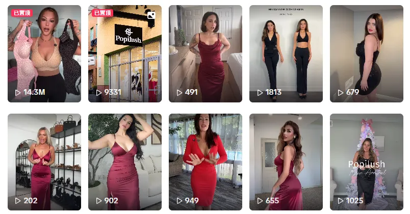 从 kalodata 平台所提供的数据可以看到,Popilush 品牌每日都会根据当下热门的品类在账号内发布多条视频,或是用户反馈,或是品牌拍摄的穿搭展示,内容并不局限,重点是突出服饰以及“挂车”。